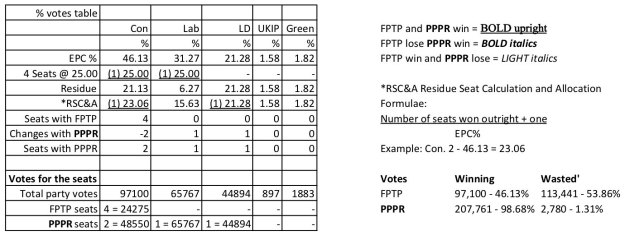 Note. With FPTP results, the % figure has preference over the number of votes due to differing electorates. With PPPR they will be equal.