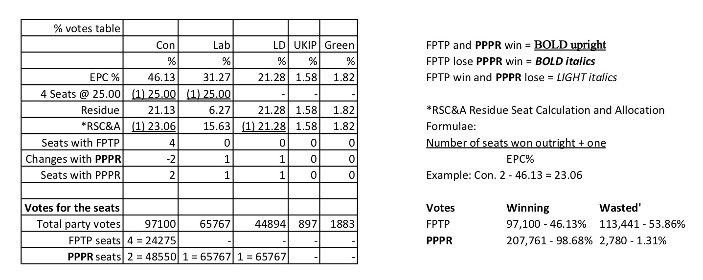 PPPR requires multi-seat constituencies – EPCs – Electing Proportional Constituencies – each with 4 seats. Then the voters could have four same party candidates (2 males, 2 female?) giving the 250,000+ voters a wider choice, with one vote on one voting paper. The A4 size voting paper, and the use of electronic counting machines, would bring many benefits, and then…