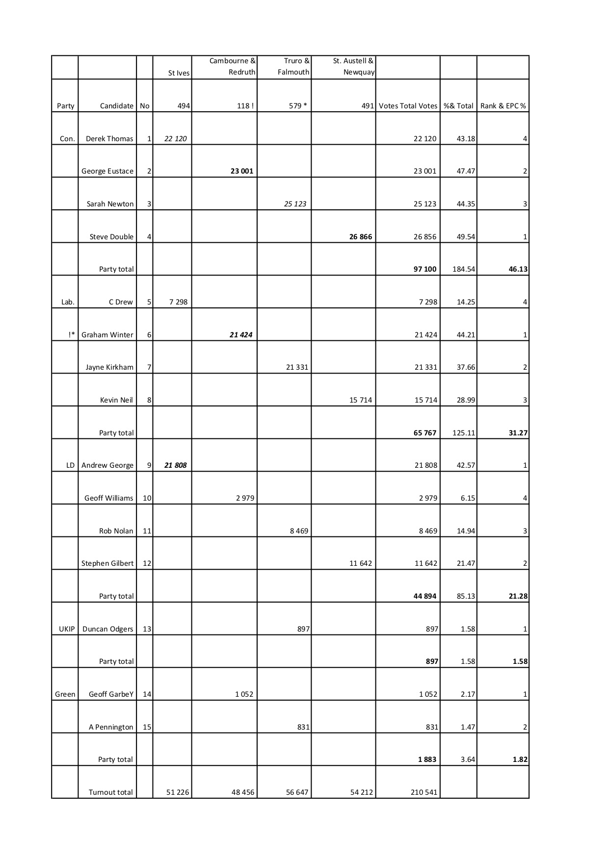 - The number of votes each candidate received in each constituency and the total % figure.